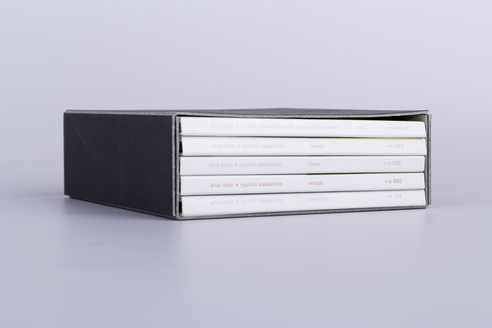 collector’s box featuring all five compact discs of alva noto & ryuichi sakamoto’s »virus« series: »vrioon« (2002, r-n050), »insen« (2005, r-n065), »revep« (2005, r-n072), »utp_« (2007, r-n096-3) and »summvs« (2011, r-n132).