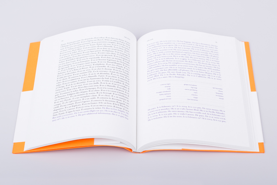 the text consists of a collection of twenty portraits written throughout the last decade. these almost photographic sketches are fed from textual blueprints which met the author at some point in time: bank statements, subway tickets, restaurant and shopping receipts are rewritten in prose, composed in simple subject-verb-complements. each piece of information becomes a sentence; all sentences are short and compact, and in fast succession, they gradually shape a story. portraits of a nurse, a teacher, an educator, a singer, an astronaut, and many others are placed end to end. the assembly of parallel lives creates a continuous thread, providing a path to follow both extreme banality and great adventures. actions, places and events are melted in the instance of a third person singular with no indication which is its true identity. it is a disturbance with many possible escape routes of dispersion and emergence.