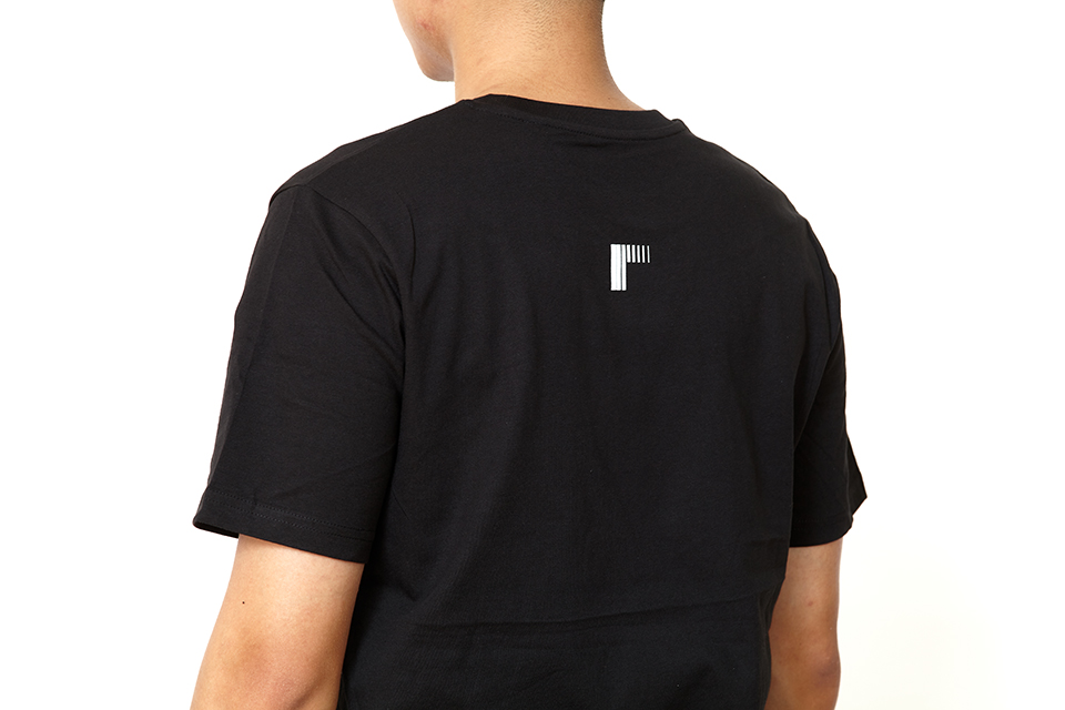 silkscreen print (pantone cool gray 1c), black organic cotton t-shirt.